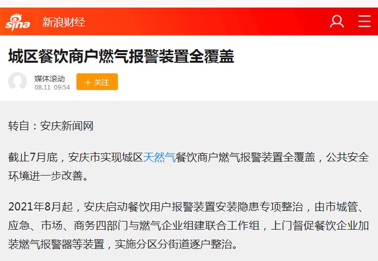 城區(qū)餐飲商戶(hù)燃?xì)鈭?bào)警裝置全覆蓋(轉(zhuǎn)載于新浪財(cái)經(jīng))