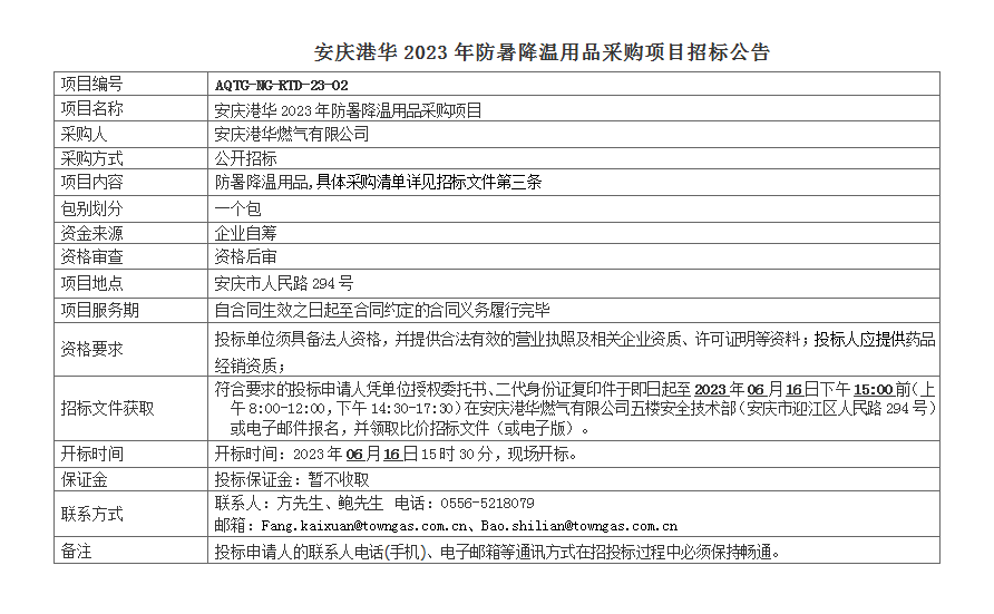 安慶港華2023年防暑降溫用品采購項目招標公告