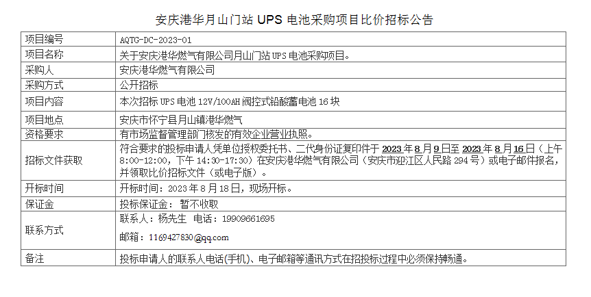 安慶港華月山門站UPS電池采購(gòu)項(xiàng)目比價(jià)招標(biāo)公告
