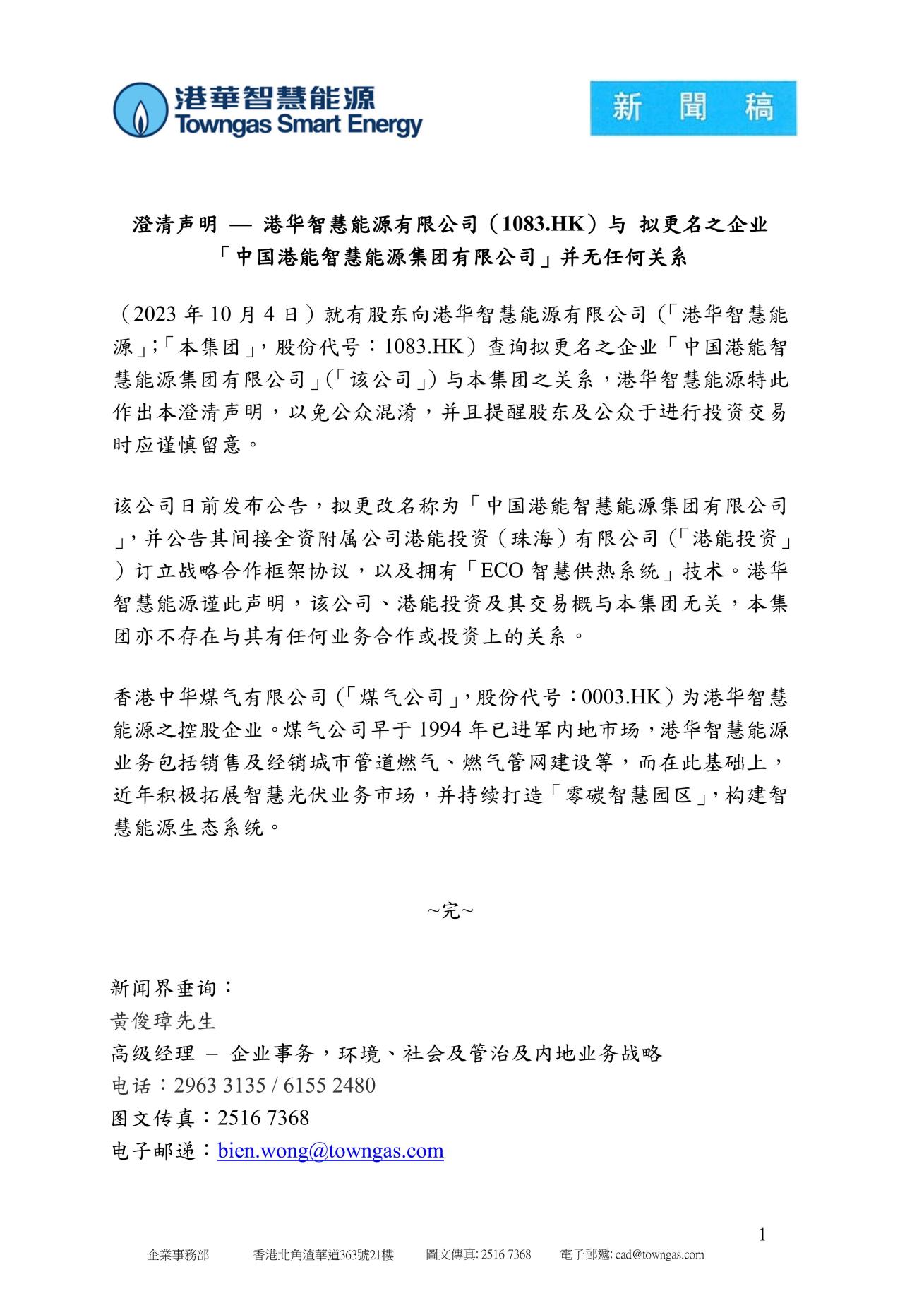 澄清聲明 — 港華智慧能源有限公司(1083.HK)與 擬更名之企業(yè) 「中國港能智慧能源集團(tuán)有限公司」并無任何關(guān)系