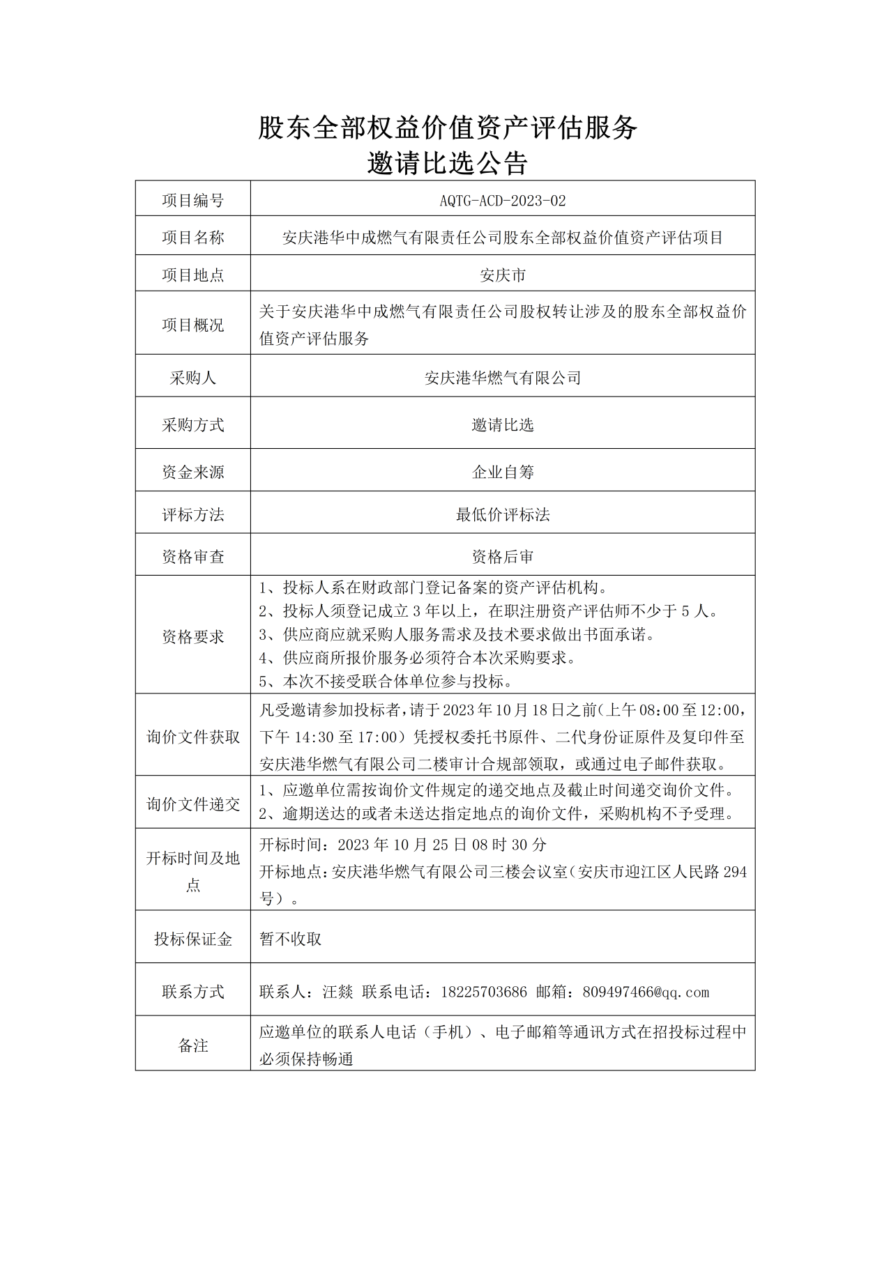 安慶港華中成燃氣有限公司股東全部權益資產(chǎn)評估服務邀請比選公告