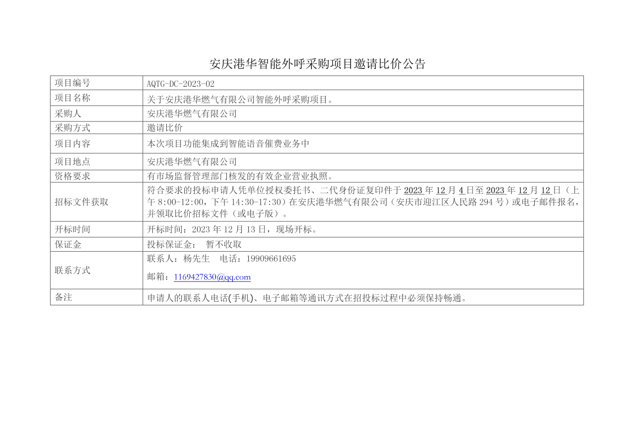 安慶港華燃?xì)庥邢薰局悄芡夂舨少忢?xiàng)目邀請比價公告