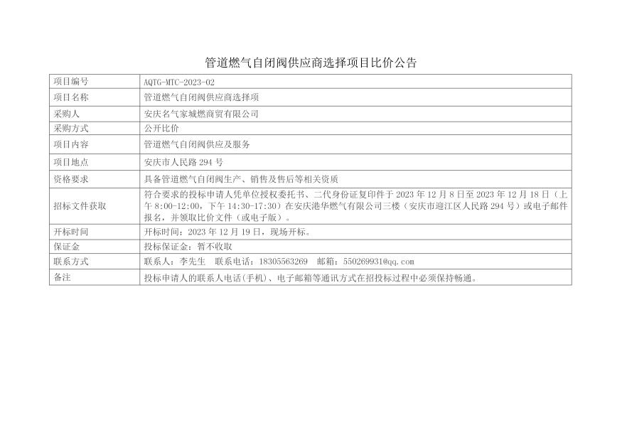 安慶港華燃?xì)庥邢薰竟艿廊細(xì)庾蚤]閥供應(yīng)商選擇項(xiàng)目比價(jià)公告