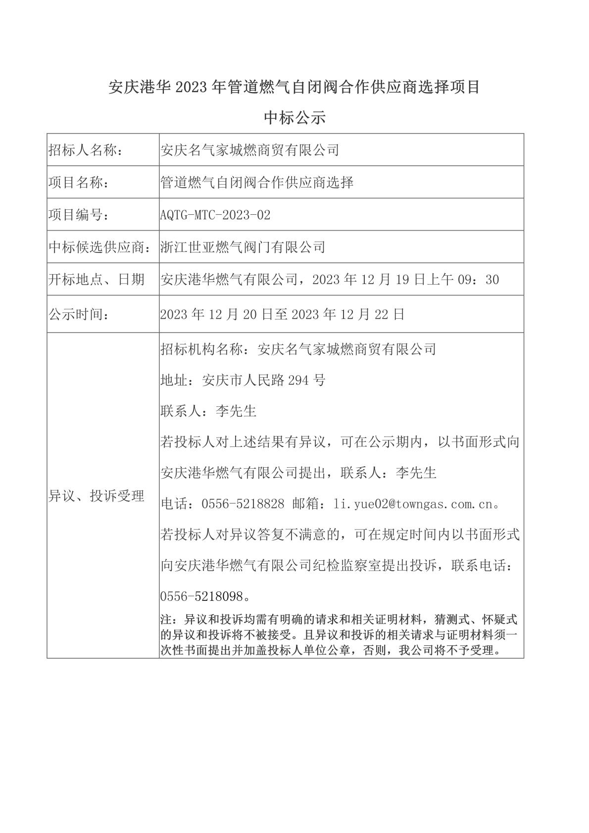 中標(biāo)公示(安慶港華2023年管道燃氣自閉閥合作供應(yīng)商選擇項目)