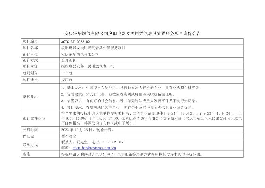 安慶港華燃氣有限公司廢舊電器及民用燃氣表具處置服務(wù)項目詢價公告