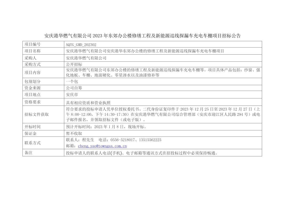安慶港華東郊辦公樓的修繕工程及新能源巡線探漏車充電車棚項(xiàng)目招標(biāo)公告