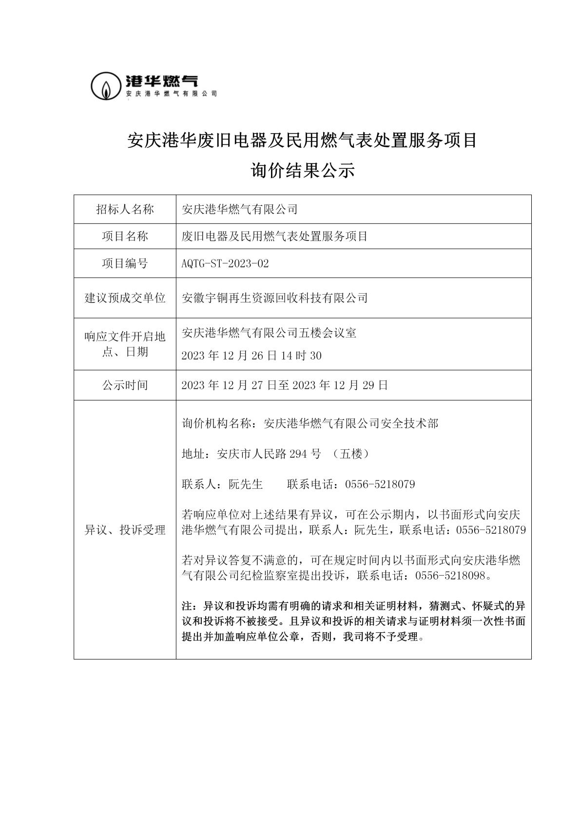 安慶港華廢舊電器及民用燃氣表處置服務(wù)項目詢價結(jié)果公示