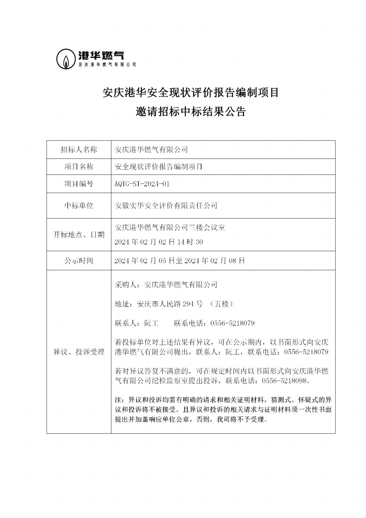 安慶港華安全現(xiàn)狀評(píng)價(jià)報(bào)告編制項(xiàng)目邀請(qǐng)招標(biāo)中標(biāo)結(jié)果公告