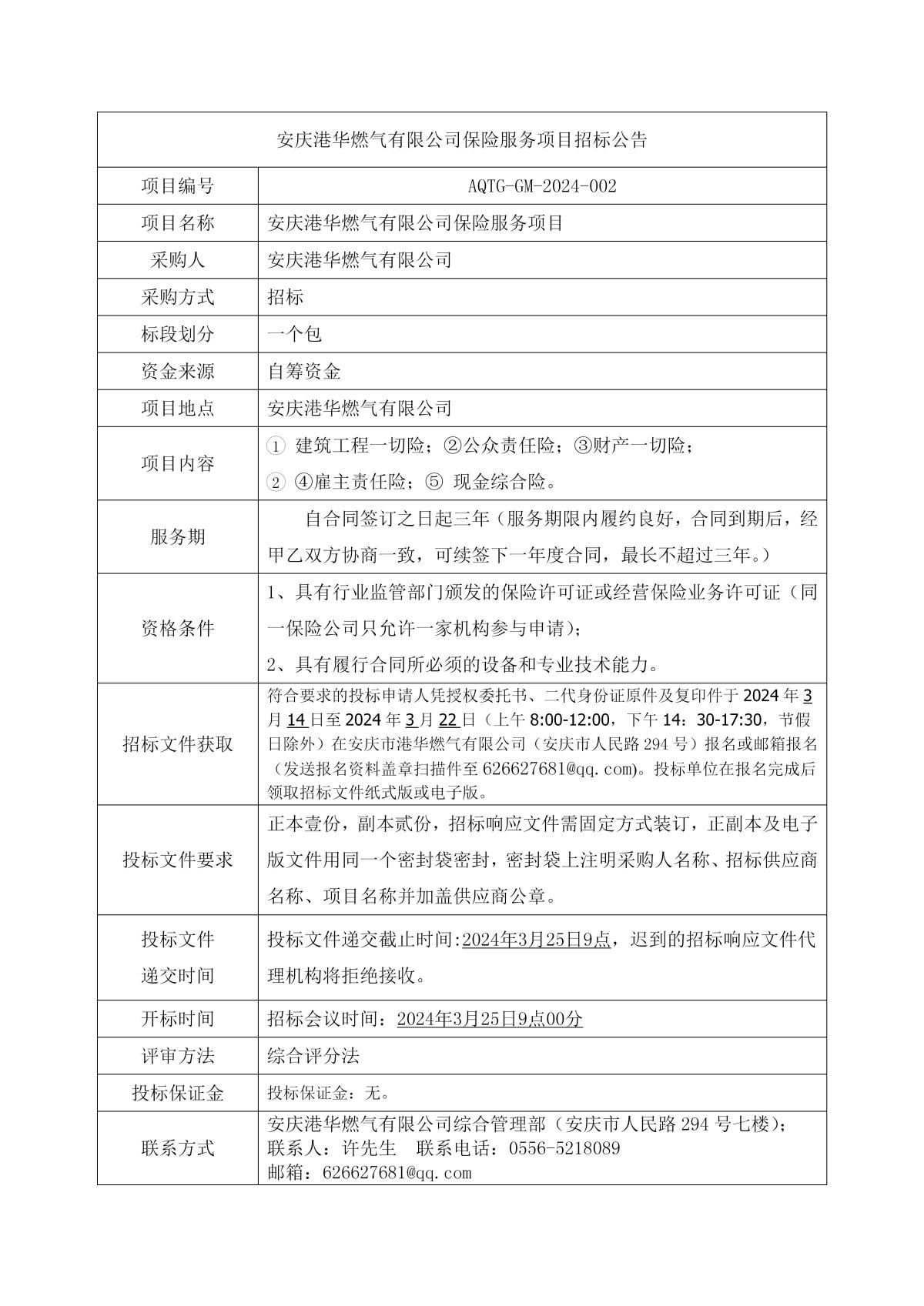 安慶港華燃?xì)庥邢薰颈kU服務(wù)項目招標(biāo)公告