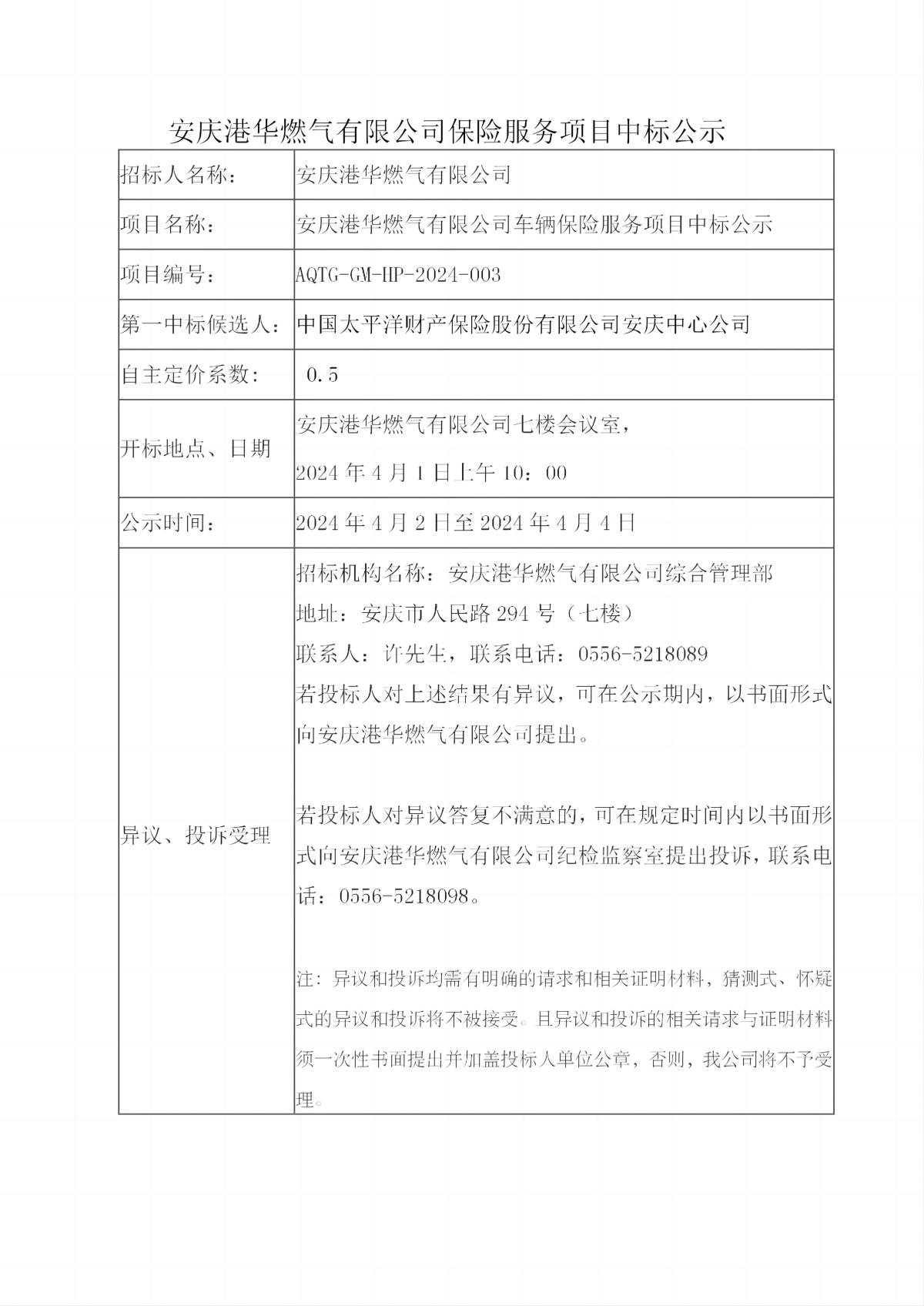 安慶港華燃?xì)庥邢薰颈kU服務(wù)項(xiàng)目中標(biāo)公示