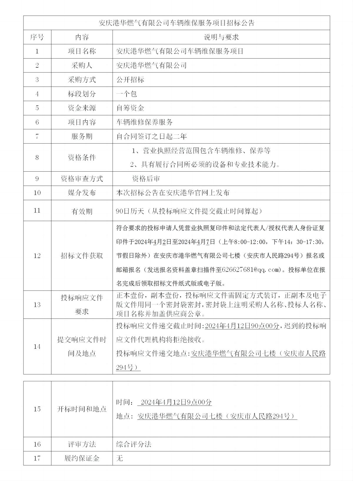 安慶港華燃氣有限公司車輛維保服務(wù)項目招標(biāo)公告