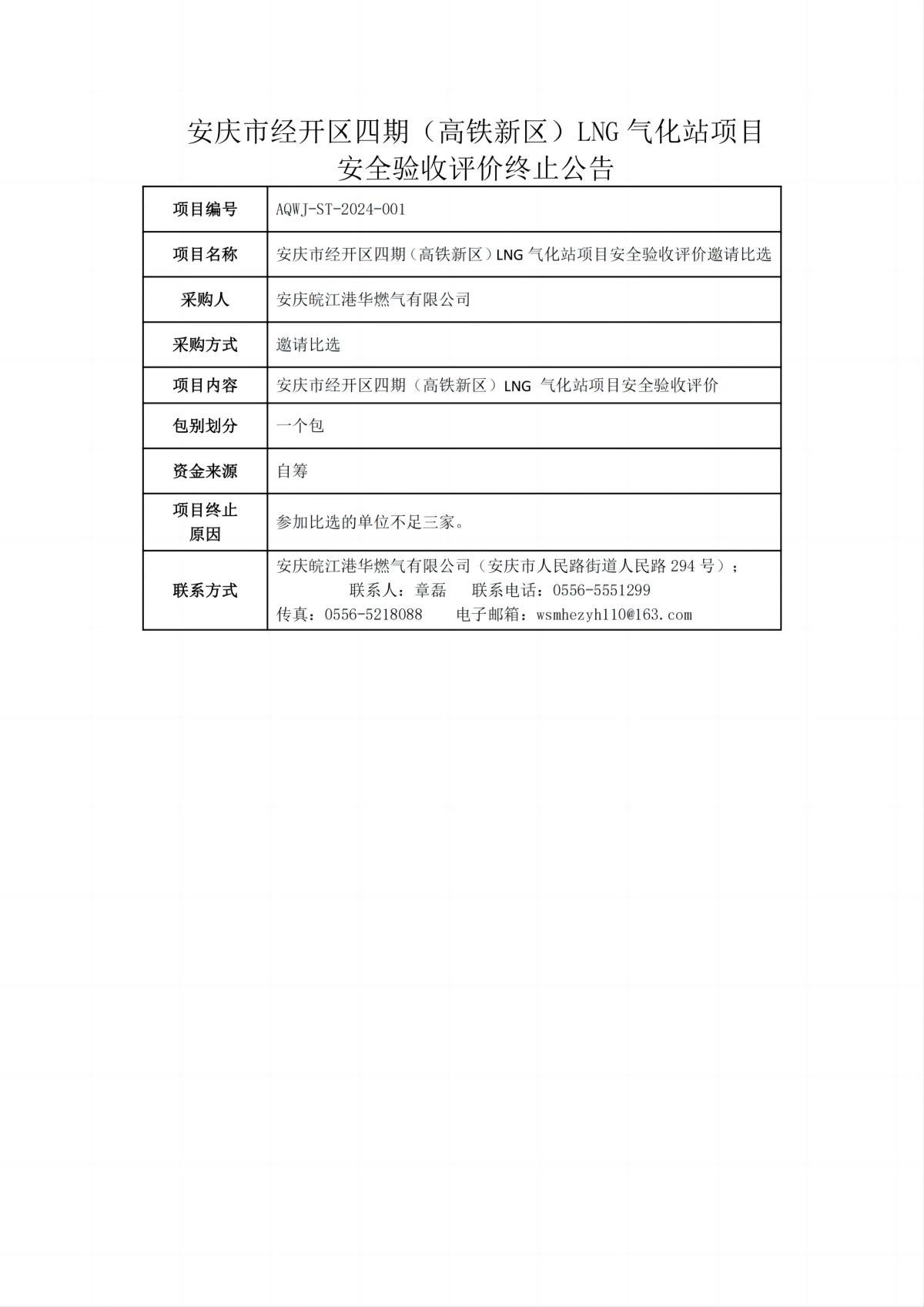 安慶市經(jīng)開區(qū)四期(高鐵新區(qū))LNG 氣化站項(xiàng)目安全驗(yàn)收評(píng)價(jià)終止公告