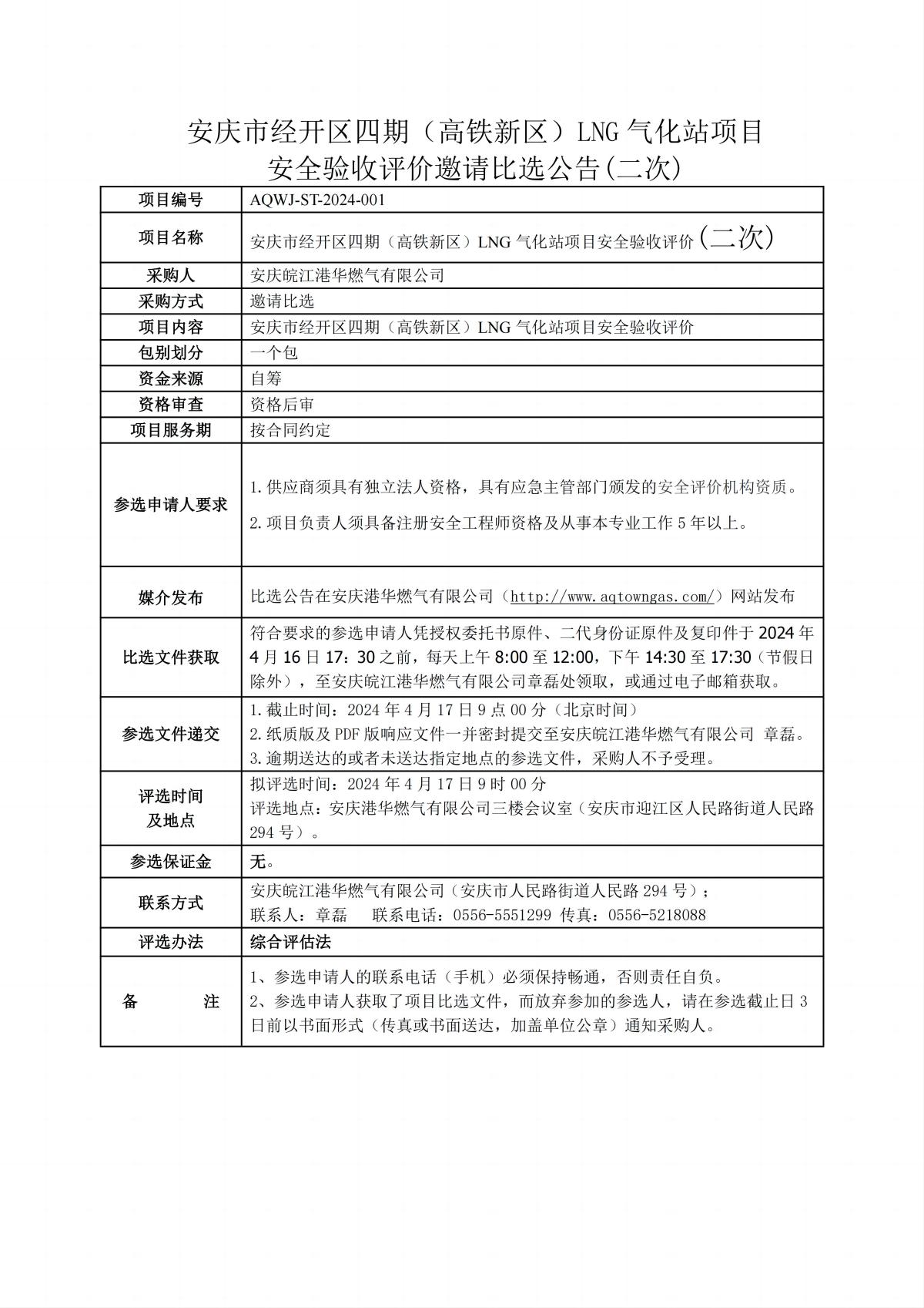 安慶市經(jīng)開區(qū)四期(高鐵新區(qū))LNG 氣化站項(xiàng)目 安全驗(yàn)收評(píng)價(jià)邀請(qǐng)比選公告(二次)