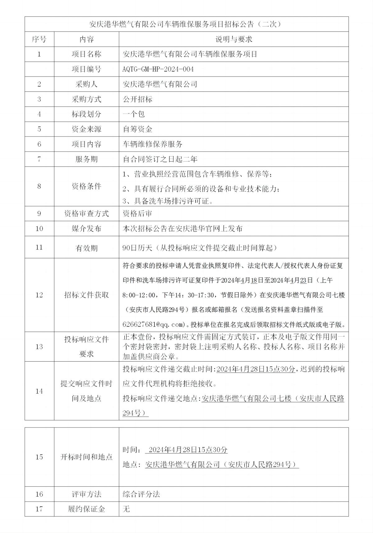 安慶港華燃?xì)庥邢薰拒囕v維保服務(wù)項目招標(biāo)公告(二次)