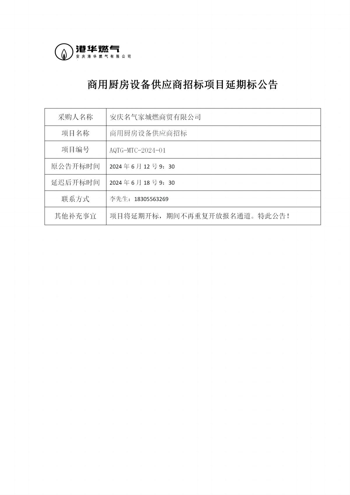 商用廚房設備供應商招標項目延期標公告
