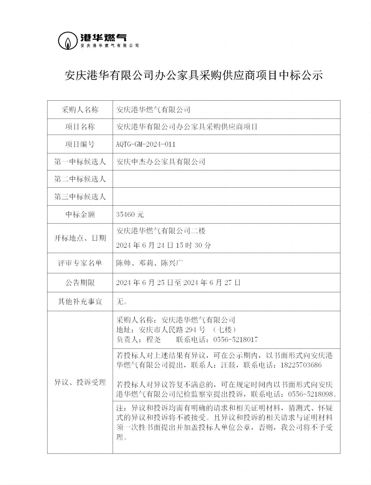 安慶港華有限公司辦公家具采購供應商項目中標公示