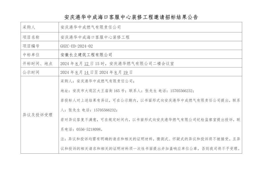 安慶港華中成??诳头行难b修工程邀請(qǐng)招標(biāo)結(jié)果公告