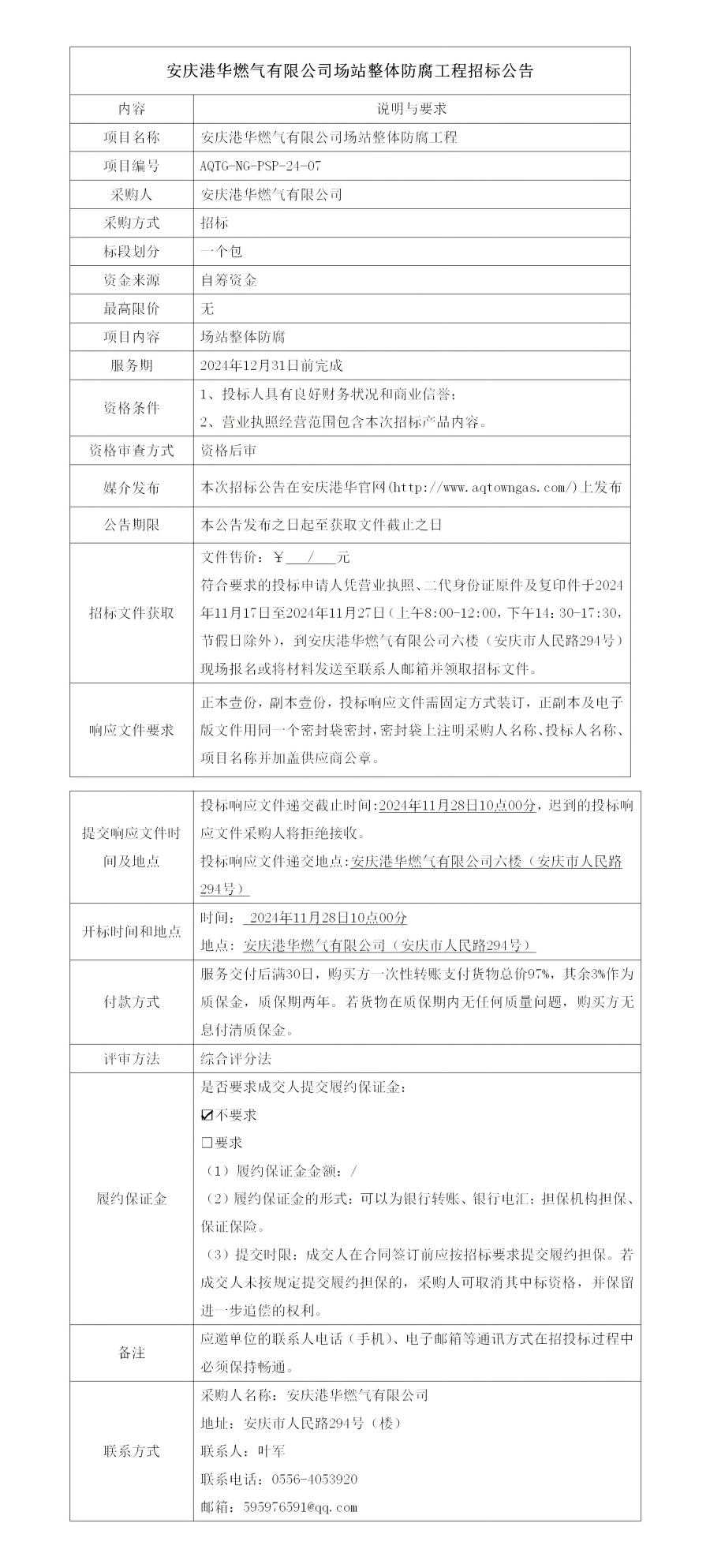 安慶港華燃?xì)庥邢薰緢?chǎng)站整體防腐工程招標(biāo)公告