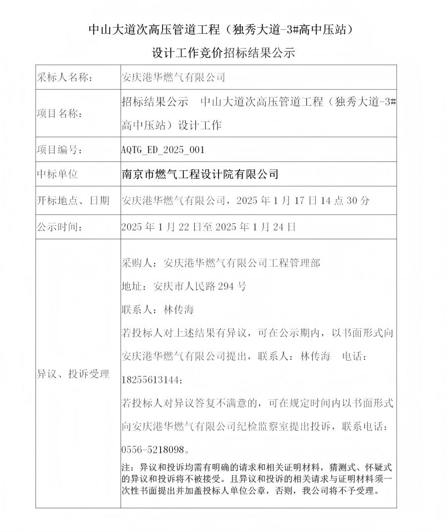 中山大道次高壓管道工程(獨秀大道-3#高中壓站)設(shè)計工作競價招標(biāo)結(jié)果公示