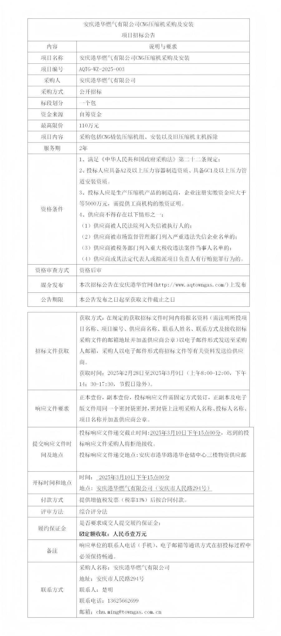安慶港華燃氣有限公司CNG壓縮機采購及安裝項目招標公告