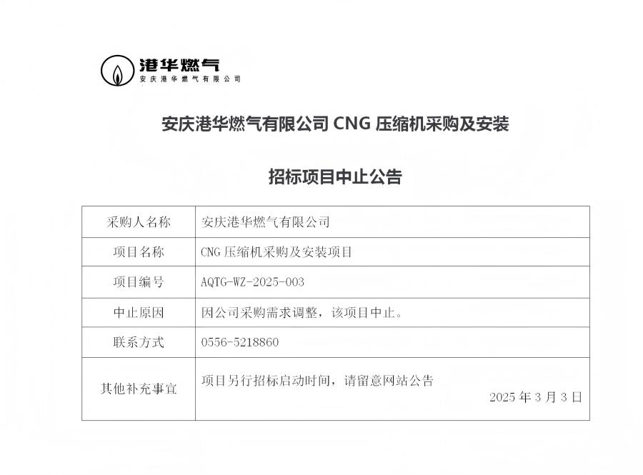安慶港華燃?xì)庥邢薰綜NG壓縮機(jī)采購及安裝招標(biāo)項目中止公告