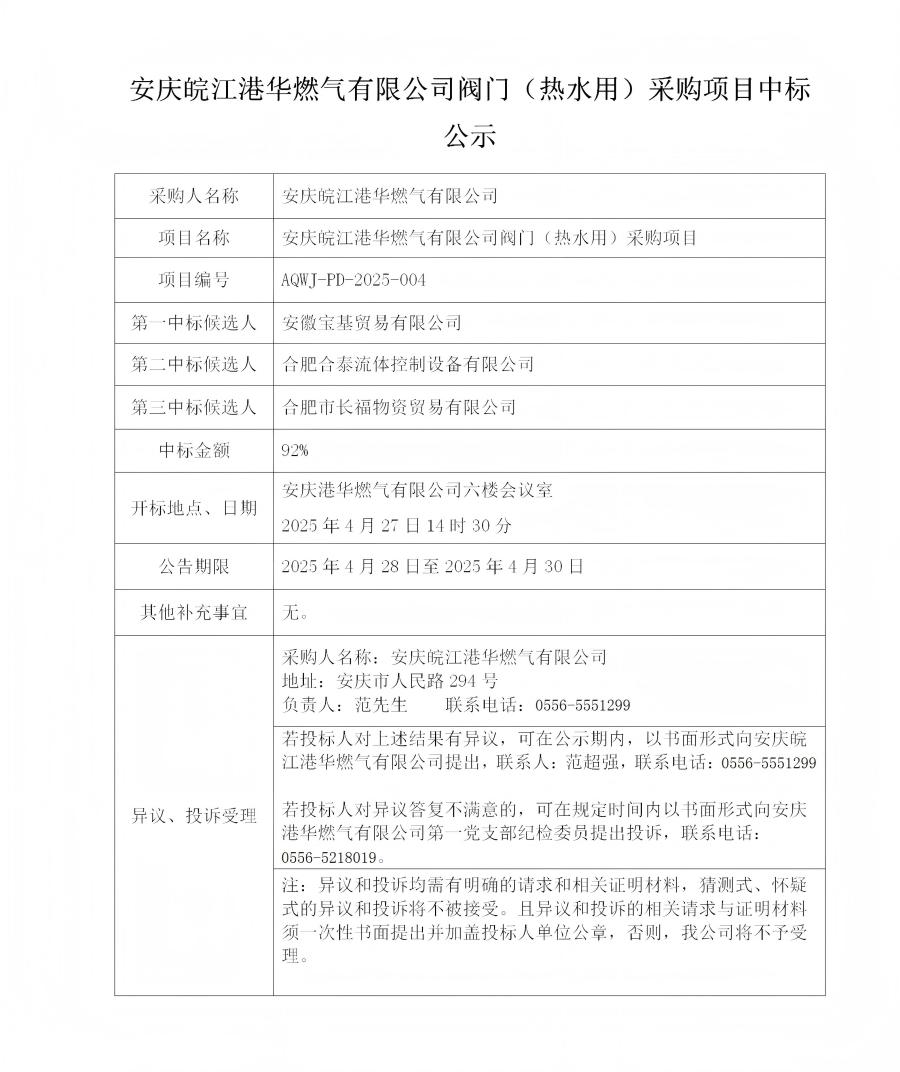 安慶皖江港華燃?xì)庥邢薰鹃y門(mén)(熱水用)采購(gòu)項(xiàng)目中標(biāo)公示