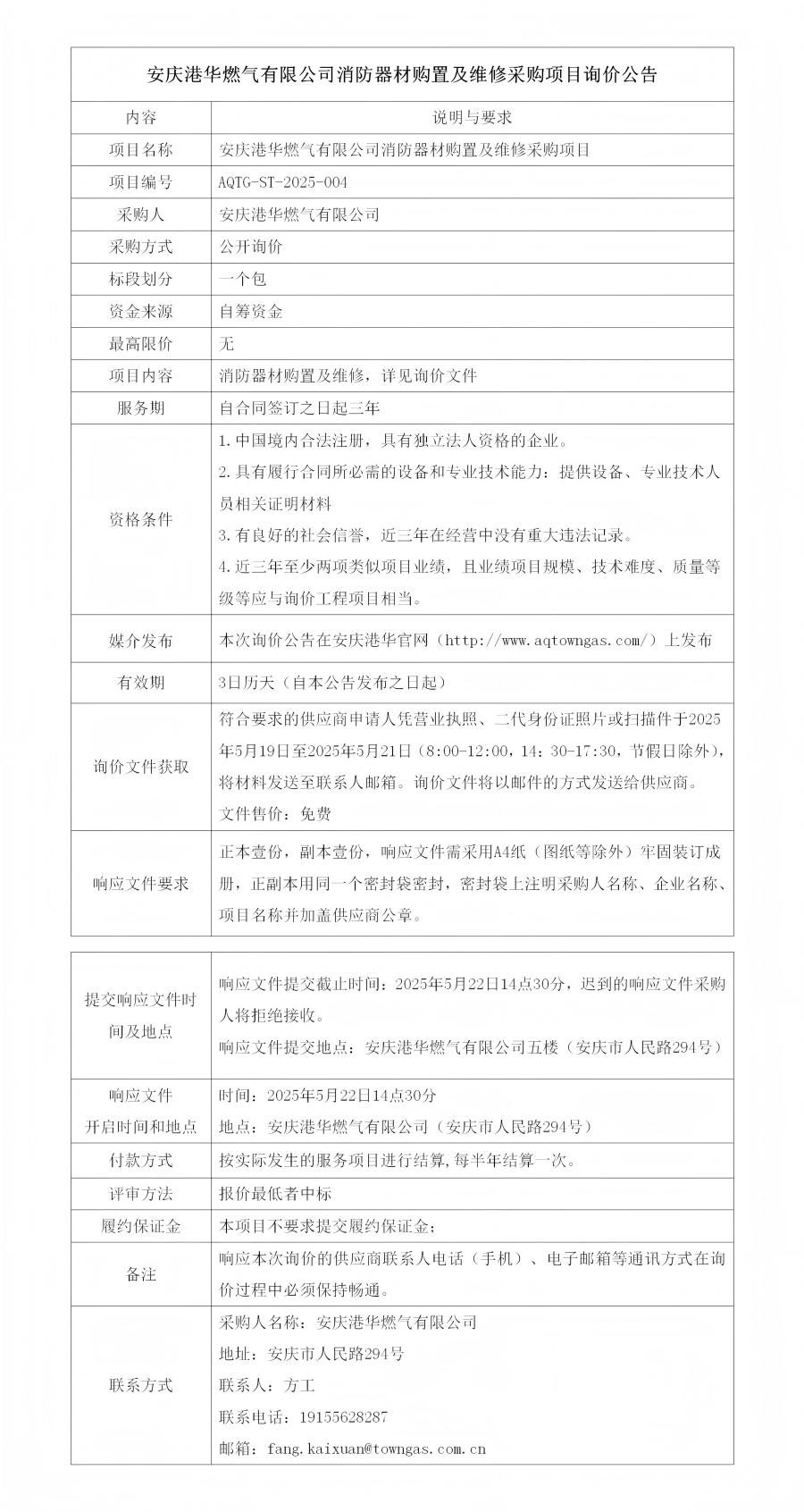 安慶港華燃氣有限公司消防器材購置及維修采購項目詢價公告