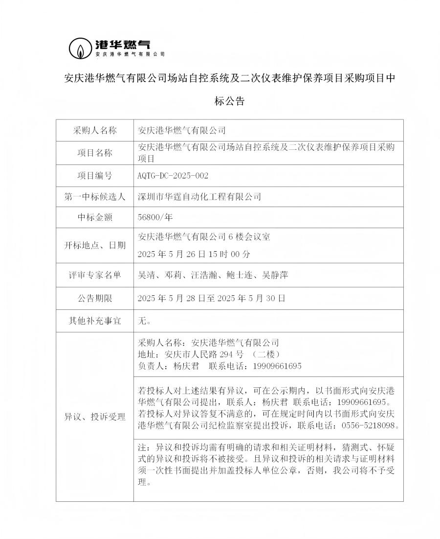 安慶港華燃?xì)庥邢薰緢?chǎng)站自控系統(tǒng)及二次儀表維護(hù)保養(yǎng)項(xiàng)目采購(gòu)項(xiàng)目中標(biāo)公告