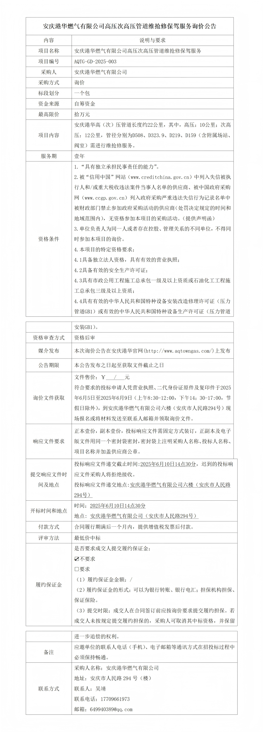 安慶港華燃氣有限公司高壓次高壓管道維搶修保駕服務詢價公告