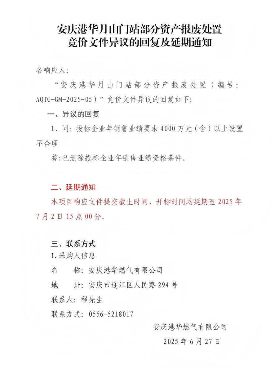 安慶港華月山門站部分資產(chǎn)報(bào)廢處置競(jìng)價(jià)文件異議的回復(fù)及延期通知