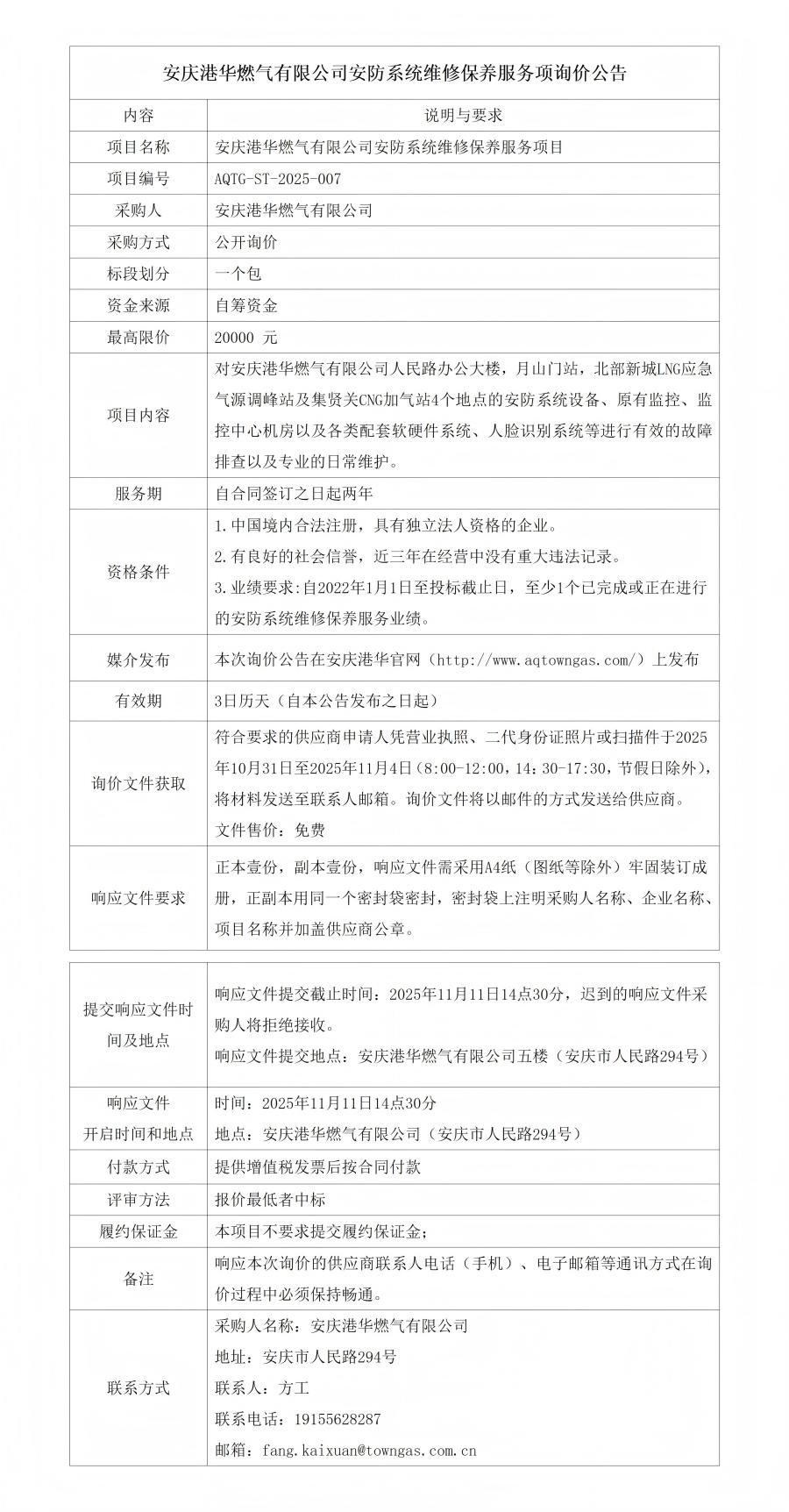 安慶港華燃?xì)庥邢薰景卜老到y(tǒng)維修保養(yǎng)服務(wù)項(xiàng)詢價(jià)公告
