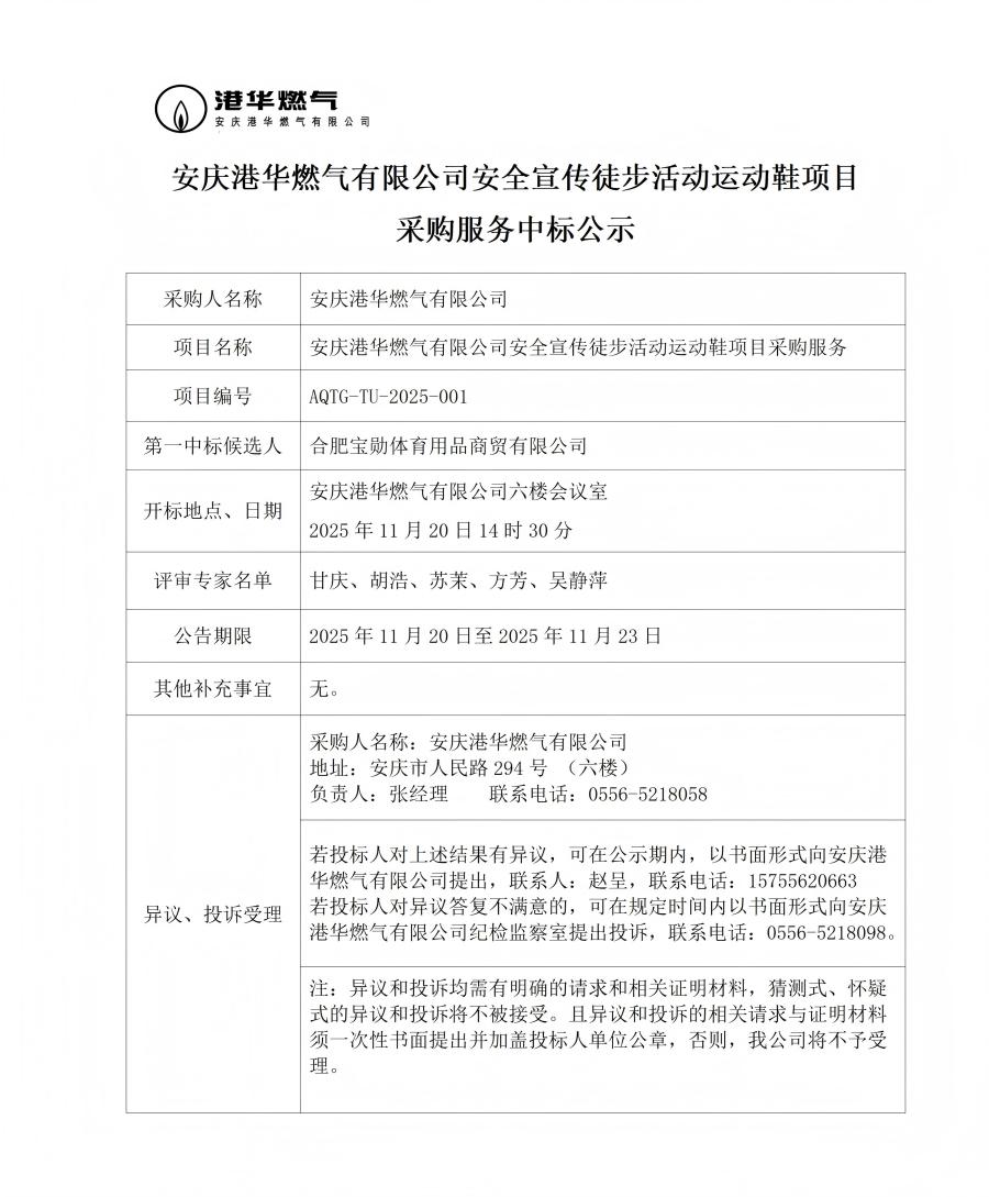 安慶港華燃?xì)庥邢薰景踩麄魍讲交顒舆\(yùn)動鞋項(xiàng)目采購服務(wù)中標(biāo)公示