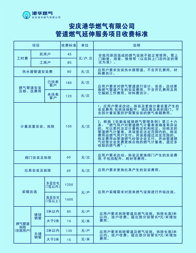 隨著安慶城市燃氣建設的快速發(fā)展,人民群眾生活水平的提高,在保障了用戶基本用氣需求的前提下,燃氣用戶對管道燃氣的延伸服務有了更多更高的要求。為滿足用戶的個性化需求,我司按照“國辦函〔2020〕129號”文件精神,結合實際情況和市場同類服務標準,按照用戶自愿、有償服務、合理收益、便于操作的原則,制定了以下延伸服務收費標準,定于2021年9月6日起執(zhí)行。